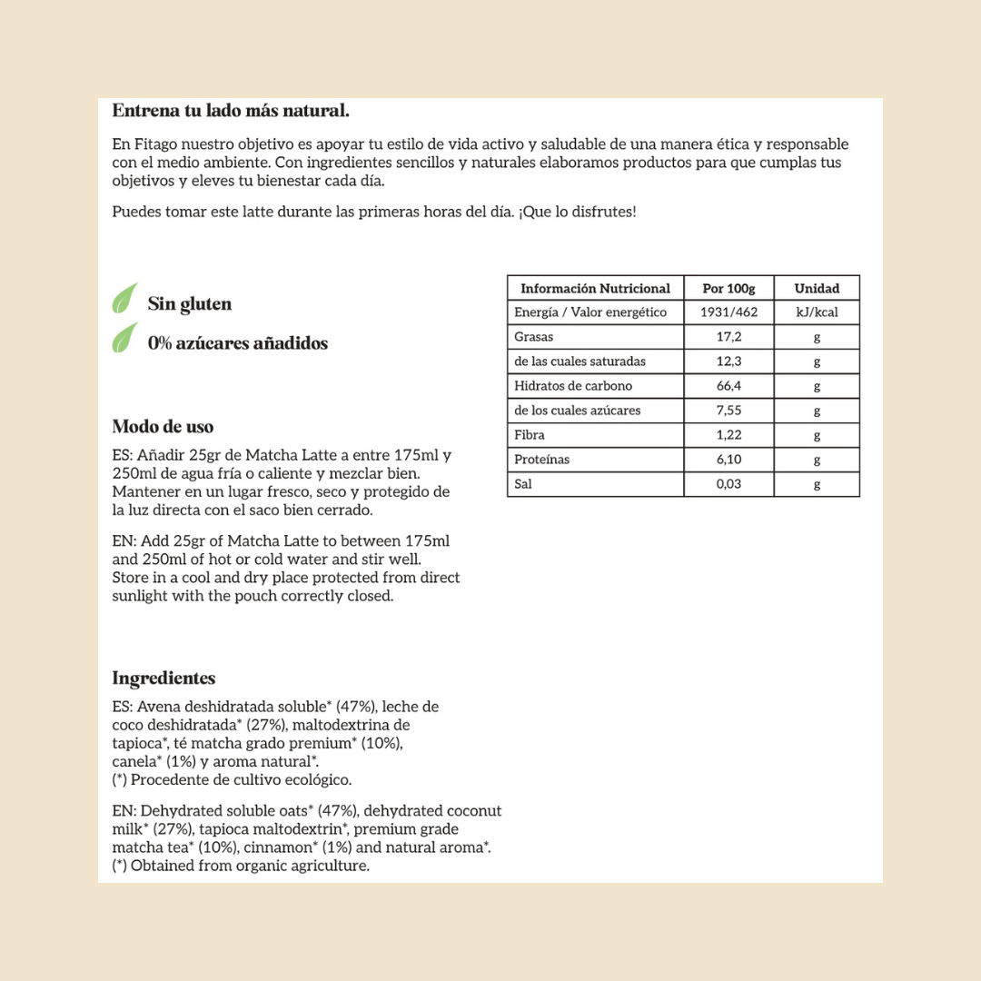 Add 25 g of Matcha Latte to between 175ml and 250ml of hot or cold water and stir well. Store in a cool and dry place protected from direct sunlight with the pouch correctly closed.