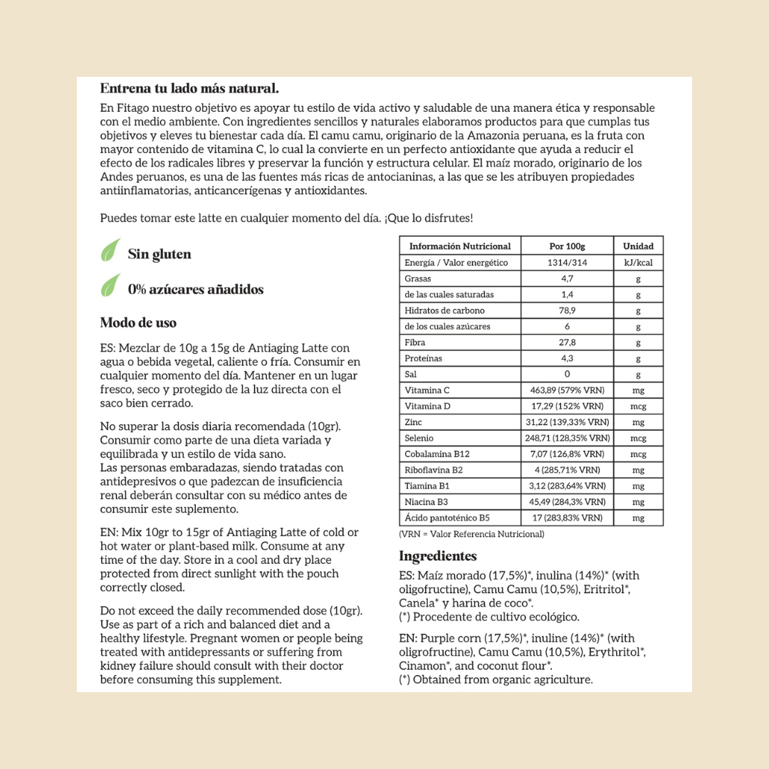 Mezclar de 10g a 15g de Antiaging Latte con agua o bebida vegetal, caliente o fría. Consumir en cualquier momento del día.